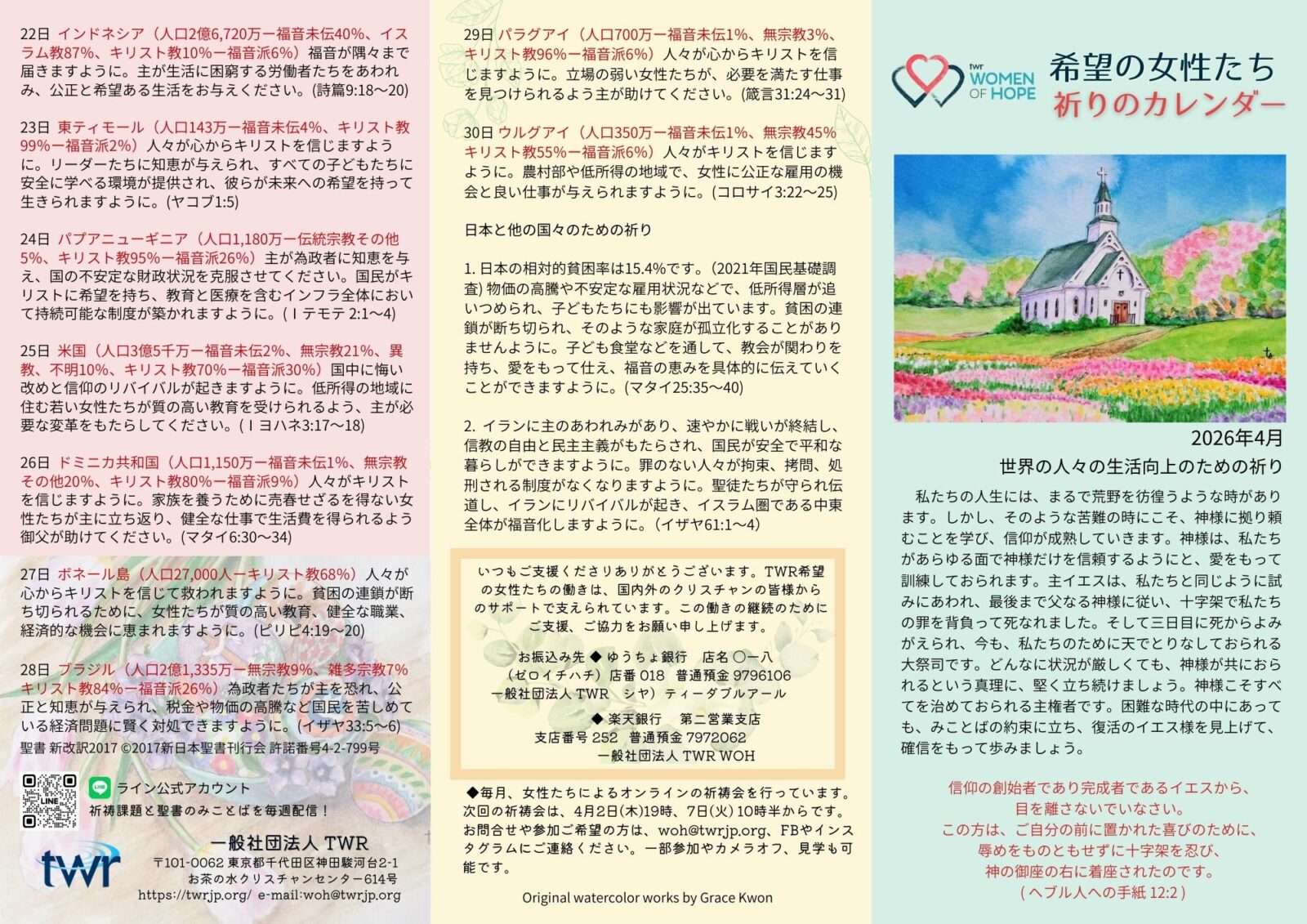 2日 各国の政府が国民に信教の自由を与え、また資源を賢く用いて弱い立場の人々を守り、女性が働く機会を創出できますように。(ヤコブ1:21~22)