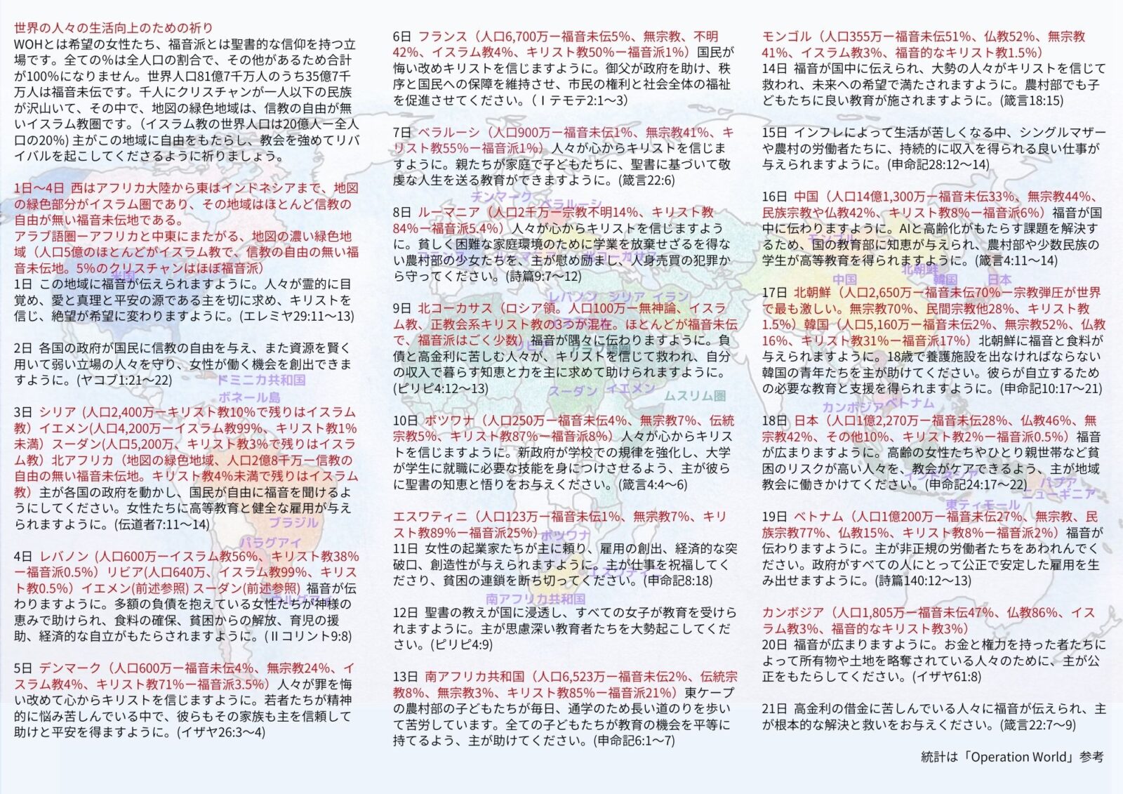 3日 シリア (人口2,400万ーキリスト教10%で残りはイスラム教)イエメン(人口4,200万ーイスラム教99%、キリスト教1%未満)スーダン(人口5,200万、キリスト教3%で残りはイスラム教)北アフリカ(地図の緑色地域、人口2億8千万ー信教の自由の無い福音未伝地。キリスト教4%未満で残りはイスラム教)主が各国の政府を動かし、国民が自由に福音を聞けるようにしてください。女性たちに高等教育と健全な雇用が与えられますように。(伝道者7:11~14)