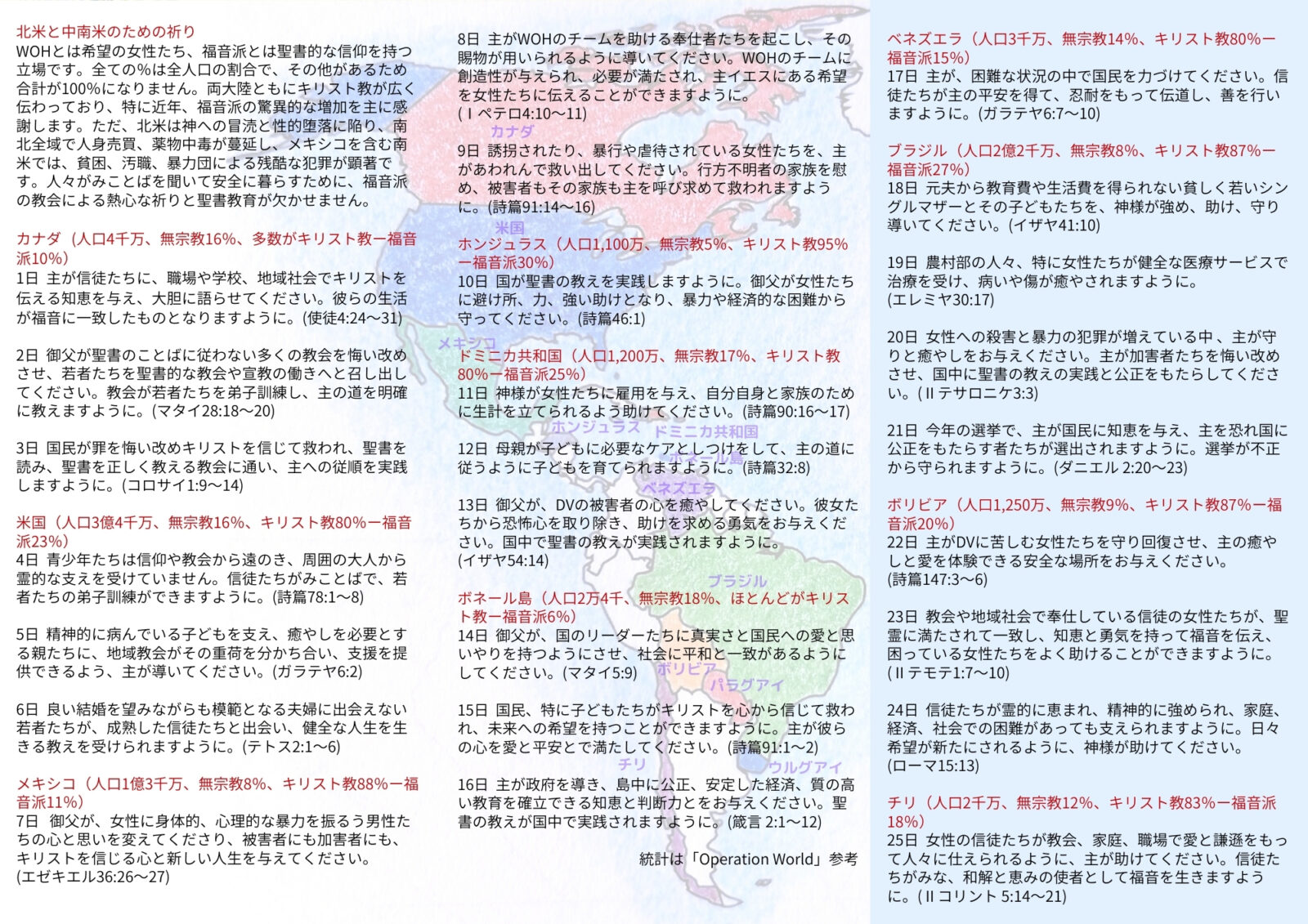 WOHとは希望の女性たち、福音派とは聖書的な信仰を持つ立場です。全ての%は全人口の割合で、その他があるため合計が100%になりません。両大陸ともにキリスト教が広く伝わっており、特に近年、福音派の驚異的な増加を主に感謝します。ただ、北米は神への冒涜と性的堕落に陥り、南北全域で人身売買、薬物中毒が蔓延し、メキシコを含む南米では、貧困、汚職、暴力団による残酷な犯罪が顕著です。人々がみことばを聞いて安全に暮らすために、福音派の教会による熱心な祈りと聖書教育が欠かせません。
